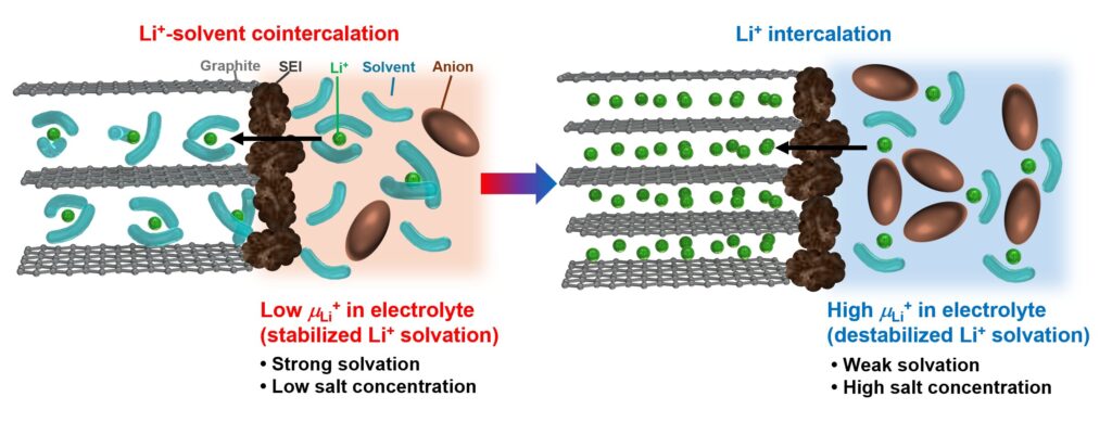 Schematic diagram of the reaction of a graphite negative electrode in different electrolytes depending on the Li+ chemical potential of the electrolyte. Credit: Advanced Materials (2025). DOI: 10.1002/adma.202514060