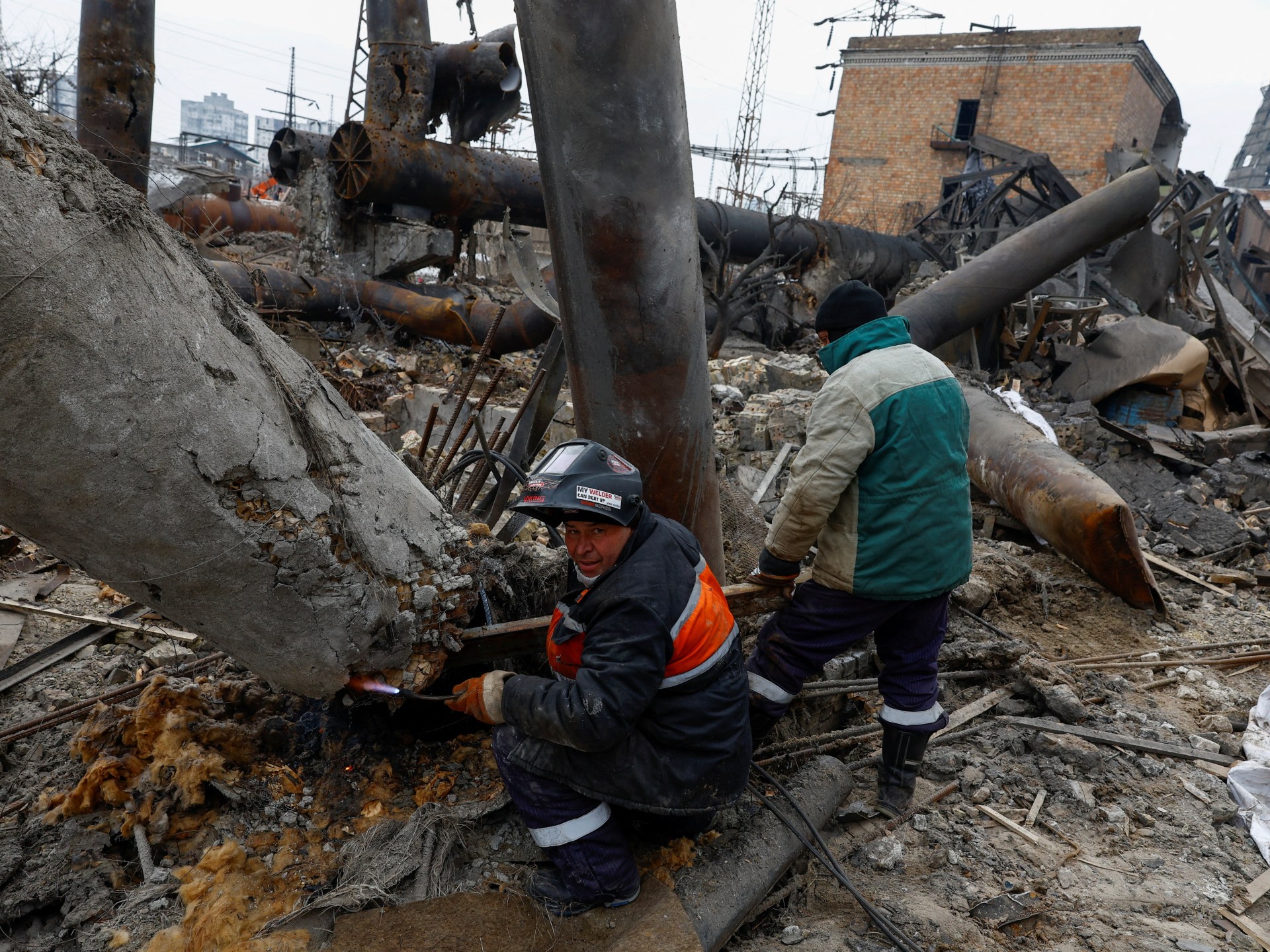 Workers repair pipes on the grounds of the Darnytsia thermal power plant, which was heavily damaged by Russian missile and drone attacks, in Kiev, Ukraine, on February 4, 2026. [File: Valentyn Ogirenko/Reuters]